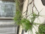 赤松の新芽は黒松に似て「つくし」の様なミドリが伸びてきますが、黒松よりも細く将来葉となるトゲが少ないのが特徴。そのためトゲとトゲの間の距離が離れ気味で、新梢が伸びるにつれ間隔が離れてしまいます。