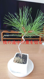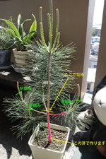 今は、そのくらいで十分かと思いますが、古葉がたくさん残っていますから、葉元から切り取って幹枝の流れが見えるようにしておいてください。葉を部分的にのこしておいても(胴吹きポイントになるので)いいですよ。