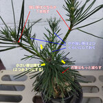 まず、古葉(前年の葉)がまだたくさんついていますから、それらはほとんど葉元から取ってしまいましょう。手で毟ってもいいですが、ハサミを使った方が樹皮を間違って剥がす失敗がないと思います。