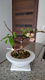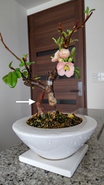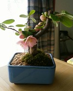 同じボケ属で日本原産の草木瓜の仲間に「長寿梅(チョウジュバイ)」があり小品向きですが、木瓜はその性質上やや大きくなりやすい性格です。