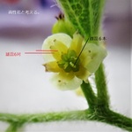 ■アオツヅラフジの雌花(左)と雄花(右)。6本の雌しべ(柱頭)の下にそれぞれ子房が付いていて、受粉すると数個の実が膨らんできます
