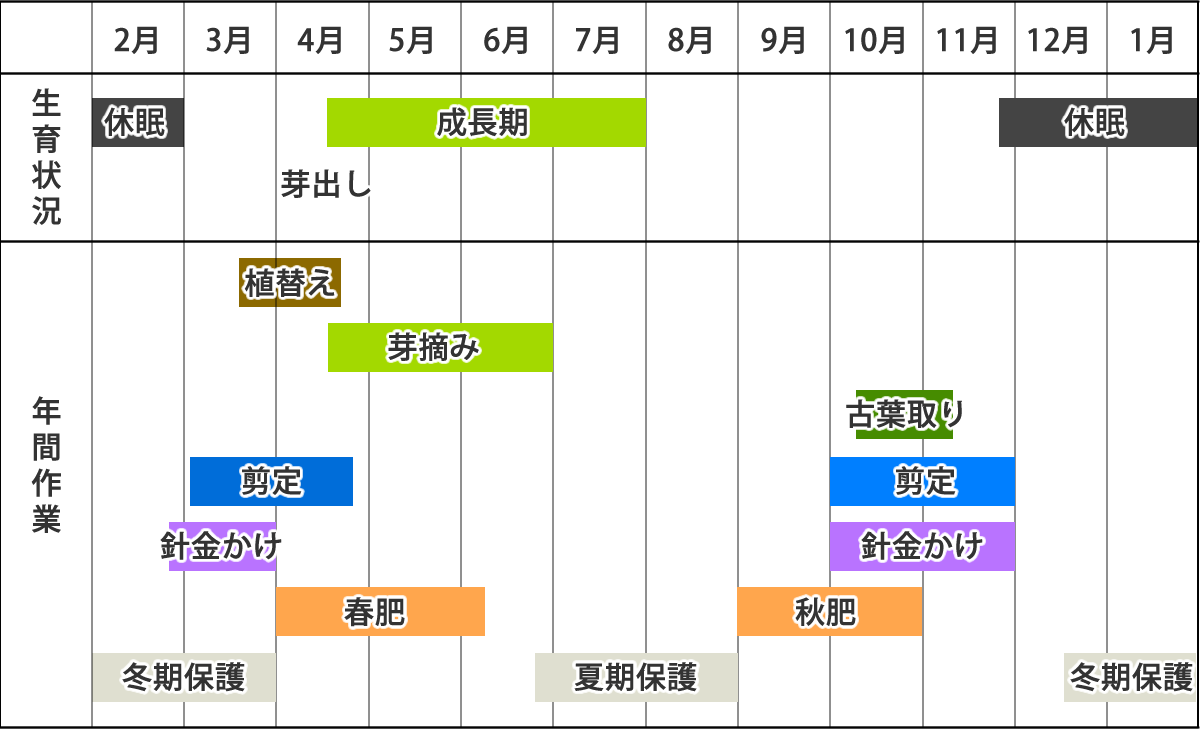 両者を混合して同じ手入れをすると樹勢を落とすなど失敗しやすいので、培養や仕立てでは両者の性質の違いを抑えておきましょう。