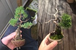 松柏類で植替えに強いのはシンパク、杜松の若い樹ですね。若い木でも半分くらいは切れます。古い樹なら1/3くらい目安。走り根などを処理しながら、細根に切り替える感じです。